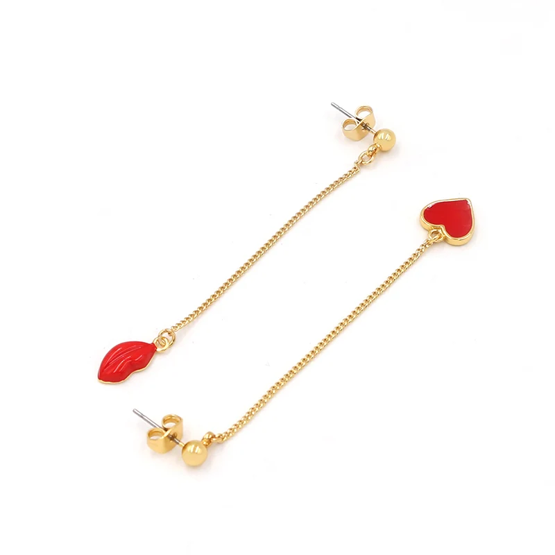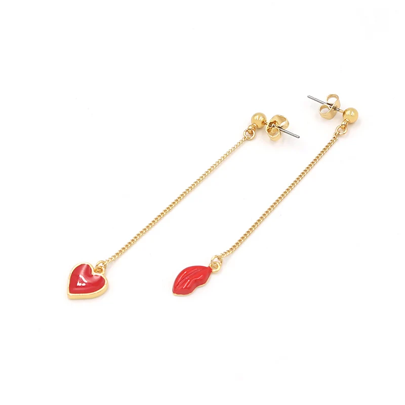Hot Tags: Brincos pendurados com longos corações de esmalte vermelho e gotas labiais